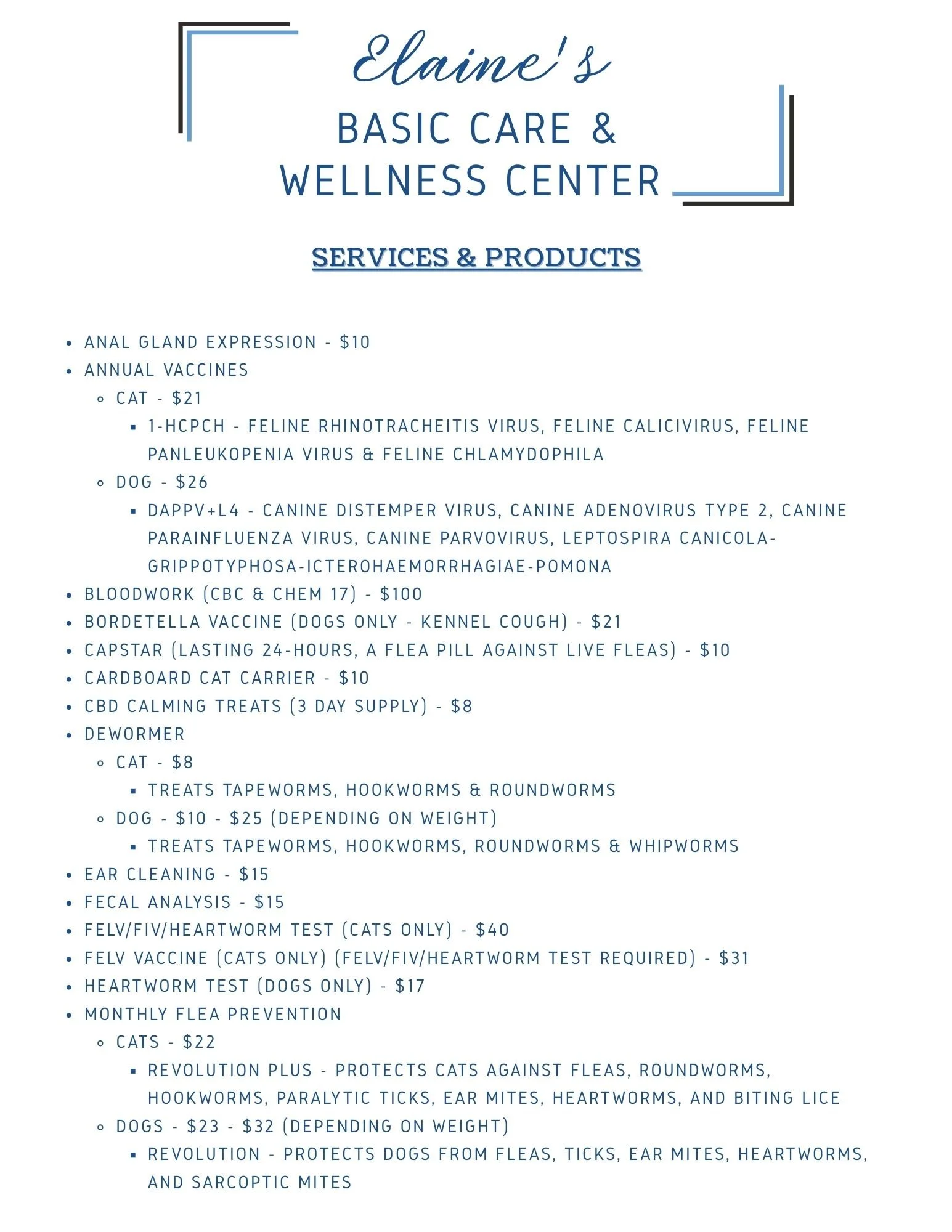 Elaine's Basic Care & Wellness Center All Pets Must Be Spayed Or Neutered To Be Eligible For Services At Our Wellness Clinic. Additional Services May Be Available Upon Request. Please Text 601-420-2438 For More Information. Request An Appointment If No Appointments Are Available Online, Please Text 601-420-2438 For Assistance.